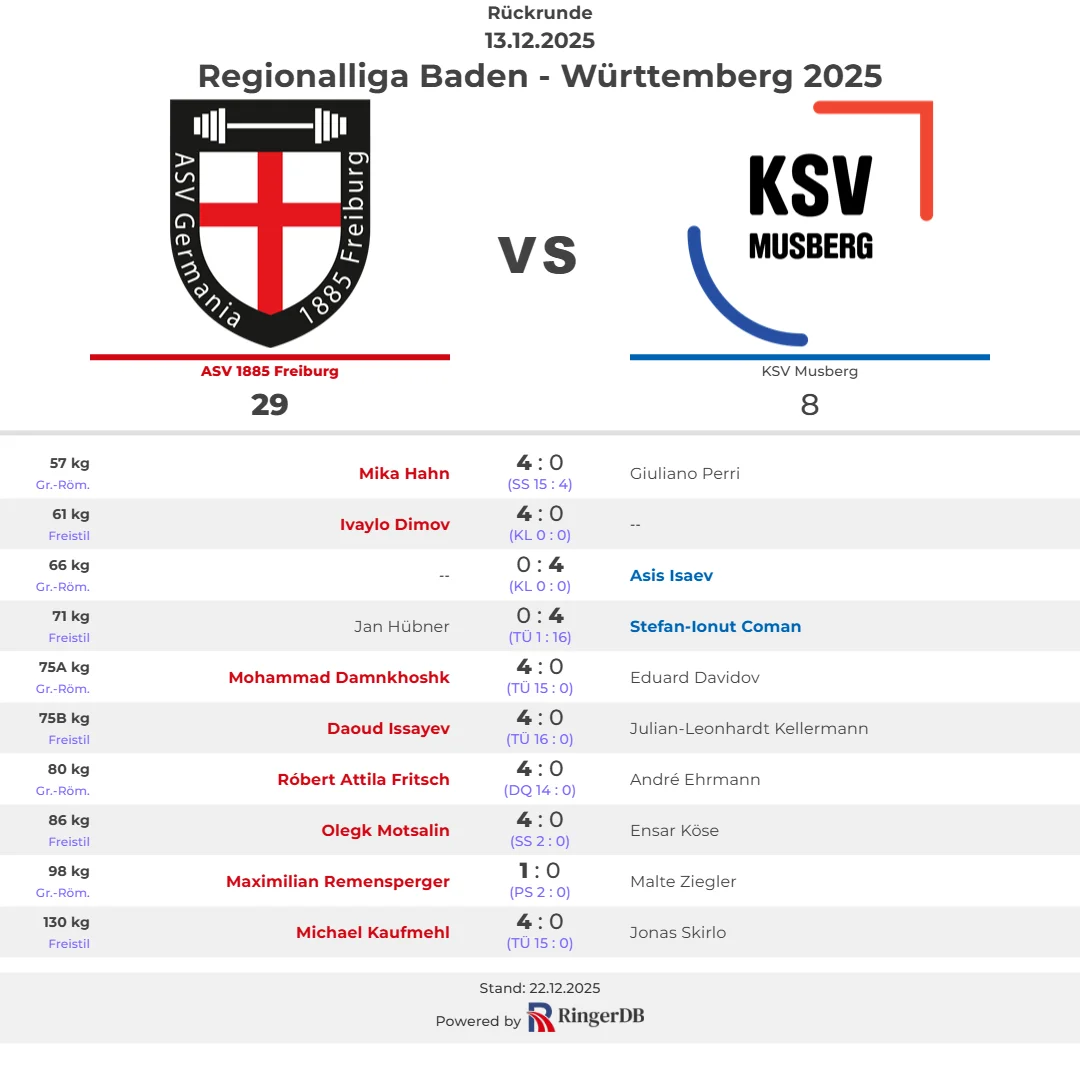 Am 13. Dezember 2025 musste der KSV Musberg in der Regionalliga Baden-Württemberg beim ASV 1885 Freiburg eine deutliche 8:29-Niederlage hinnehmen. In der stimmungsvollen Freiburger Halle erlebten die zahlreich mitgereisten Musberger Fans einen Abend, an dem Einsatz und Kampfgeist stimmten, das Ergebnis aber klar für die Gastgeber ausfiel.