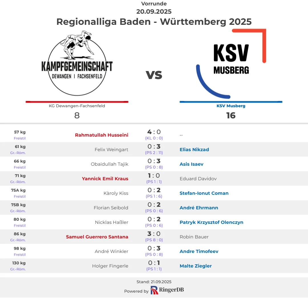 Die Gastgeber starteten mit einem kampflosen Sieg im 57-kg-Freistil, Rahmatullah Husseini holte vier Mannschaftspunkte für die KG. Doch Musberg antwortete sofort: Schwergewichtler Malte Ziegler erkämpfte sich in einem zähen Duell einen knappen Punktsieg gegen Holger Fingerle. Elias Nikzad (61 kg GR) drehte im Anschluss mit schnellen Aktionen auf und gewann klar 11:2 gegen Felix Weingart.