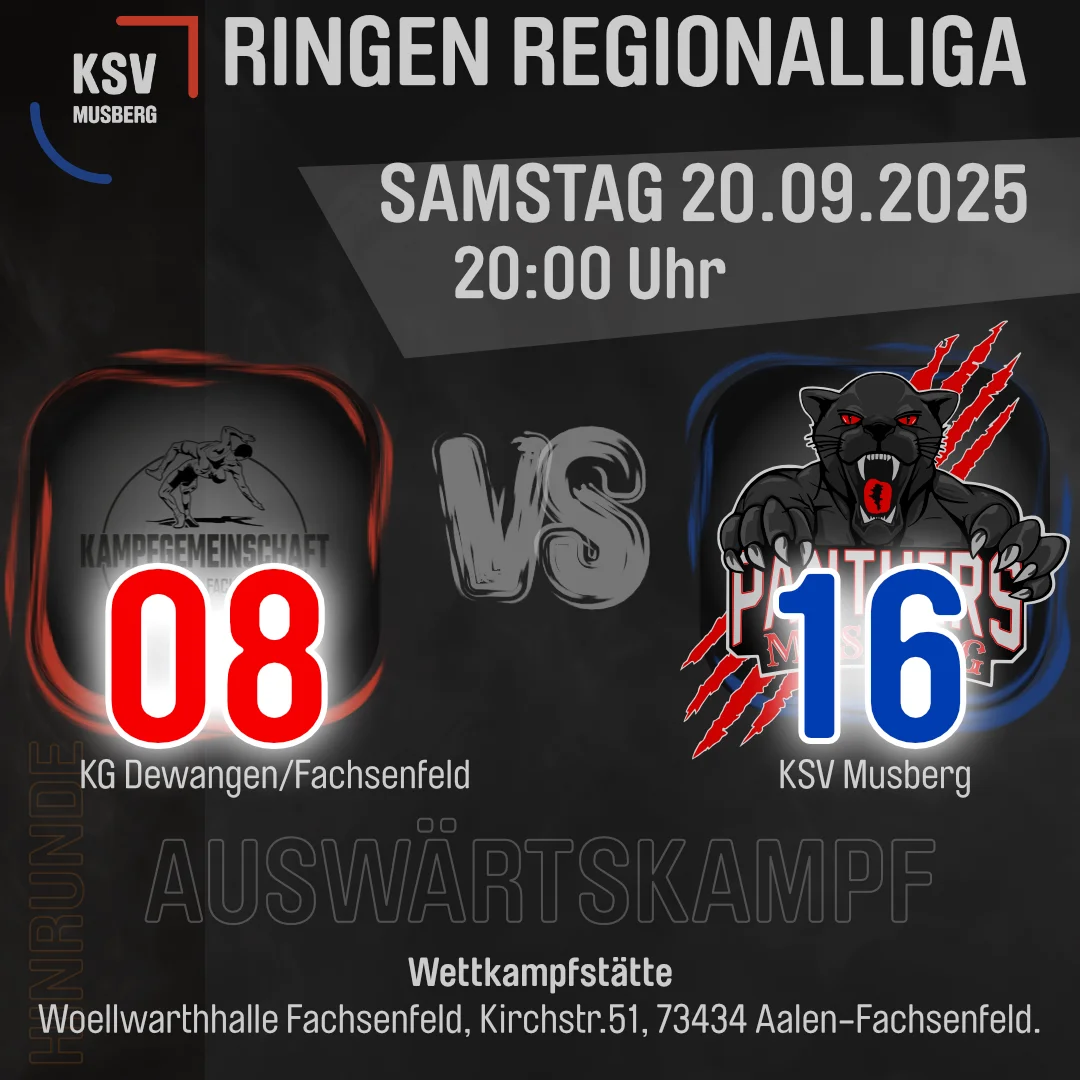 Am Samstagabend gastierte der KSV Musberg in der Regionalliga Baden-Württemberg bei der KG Dewangen-Fachsenfeld. Vor lautstarker Kulisse in der Halle entwickelte sich ein intensiver und stimmungsvoller Mannschaftskampf, der den Zuschauern alles bot: Kampfgeist, technische Klasse und spannende Duelle bis zur letzten Sekunde.